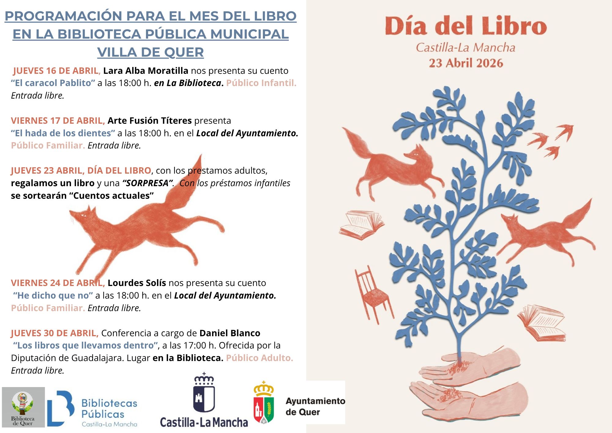 BPM Villa de Quer Día del Libro 17 de Abril de 2026 Adjuntamos la programación de la Biblioteca Pública Municipal de la Villa de Quer con motivo del Día del Libro 2026 Descargar cartel programacion 302.18 KB ¿Te ha gustado? Comparte: Noticias relacionadas Día del Libro Museo de Santa Cruz -Día del Libro El Museo de Santa Cruz nos invita a la Conferencia de Federico de Arce Federico de Arce... 17 de Abril de 2026 Animación a la lectura VOCES DE NUESTRA TIERRA -Asociación... Desde BICRA (Bibliotecarios de Ciudad Real Asociados) propone el IV Encuentro literario en... 17 de Abril de 2026 Día del Libro BPM José Jiménez - Membrilla Adjuntamos el programa actividades preparadas en la Biblioteca Pública Municipal de... 17 de Abril de 2026 Día del Libro BPM Lope de Vega- Manzanares Adjuntamos la información de todas las actividades organizadas por la Biblioteca para... 17 de Abril de 2026 Animación a la lectura Premios María Moliner 2026 Con fecha 15 de abril de 2026 se ha publicado en el BOE el extracto de la convocatoria... 17 de Abril de 2026 Día del Libro de Castilla-La Mancha Adjuntamos el cartel y el manifiesto en formato jpg. Os recordamos que tanto el cartel... 13 de Abril de 2026 AnteriorSiguiente