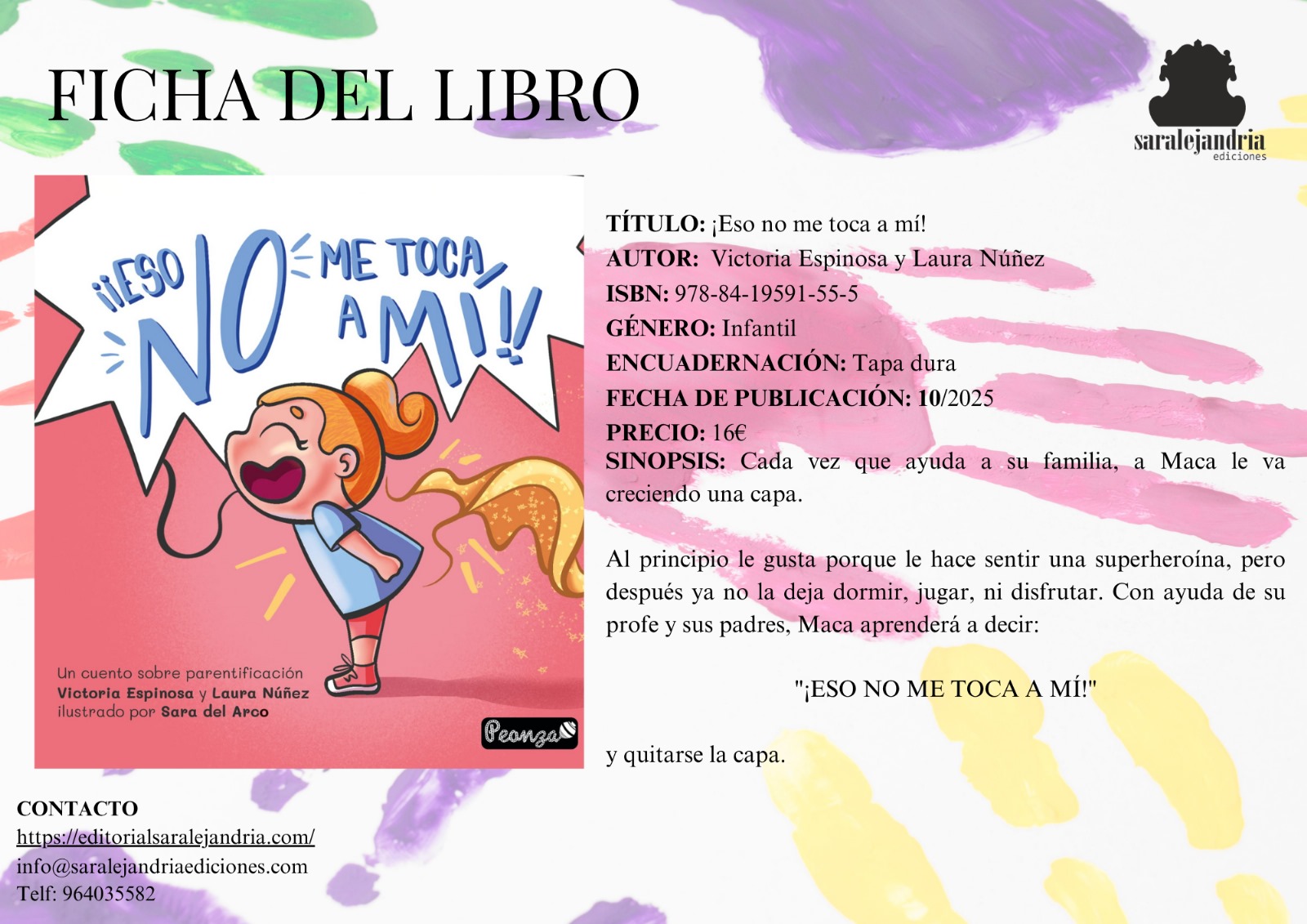 Eso no me toca a mí”, de Victoria Espinosa y Laura Núñez; ilustraciones de Sara del Arco, publicado en octubre del 2025 en la editorial Peonza.